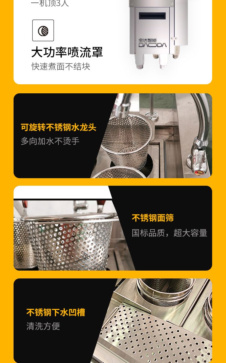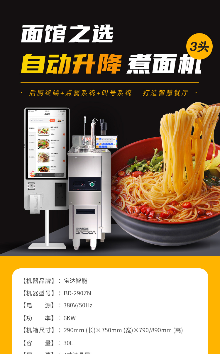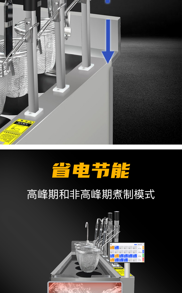 訂購標配:智能溫控系統、獨立控制自動升降桿、高峰期和非高峰期煮制模式、低水位斷電保護、大功率噴流罩、精制面簍