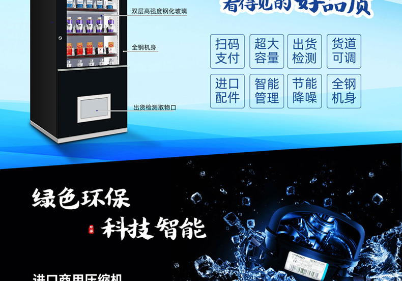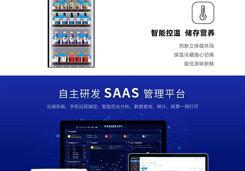 訂購標配:(0°c~8°c )制冷機組+數(shù)碼電子標簽+智能防盜門+智能電動取貨門+10.1寸液晶屏+觸摸屏+安卓主機+微信及支付寶支付
