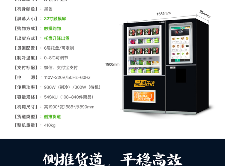 訂購標配:(0°c~8°c )制冷機組+數碼電子標簽+智能防盜門+智能電動取貨門+22寸液晶屏+觸摸屏+TEI45主機+微信及支付寶支付